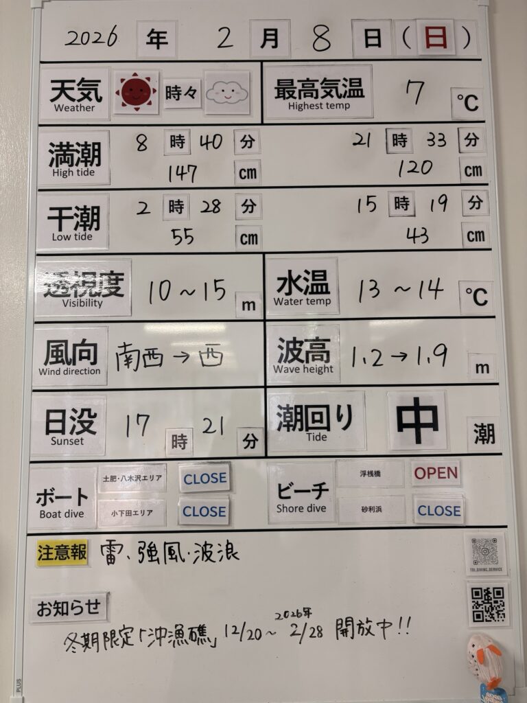 2026年2月8日 / 最終更新日 : 2026年2月8日 toids2021 海況情報 ビーチのみ【OPEN】、ボートは【CLOSE】です。 強い西風の影響でボートはオールCLOSEです。 鉄壁のビーチは問題なく潜れます! FacebookXCopy
