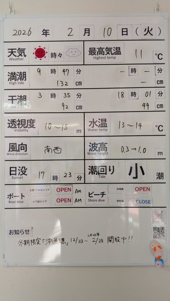 2026年2月10日 / 最終更新日 : 2026年2月10日 toids2021 海況情報 ビーチ&ボートともに【OPEN】です。 風もなく非常に穏やかな海況! 午後からは南西風が強くなりますので、ボートは午前中のみとなりそうです。 FacebookXCopy