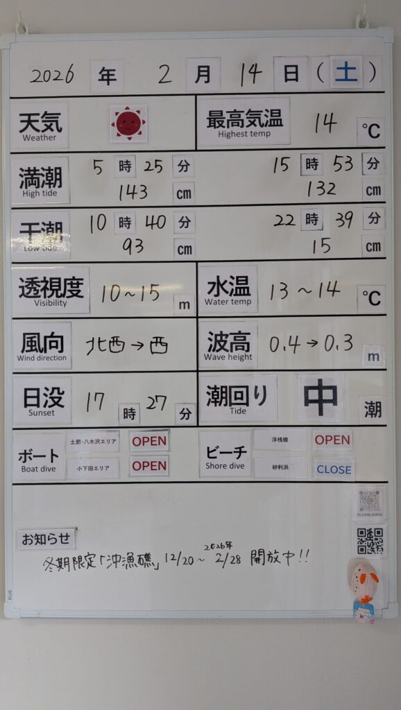 2026年2月14日 / 最終更新日 : 2026年2月14日 toids2021 海況情報 ビーチ&ボートともに【OPEN】です。 風もなく非常に穏やかな海況! ボートも快適に出船できます。 昼過ぎから西風が増してくる予報ですので、ボートは早めほどよいでしょう。 FacebookXCopy