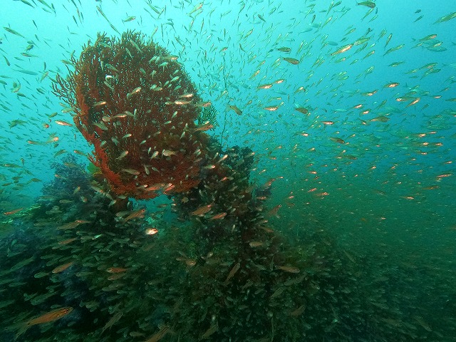 ネンブツダイの位置がいつもより南側なために、濃い霧のような群れが映えポイントを飲み込んでいます。