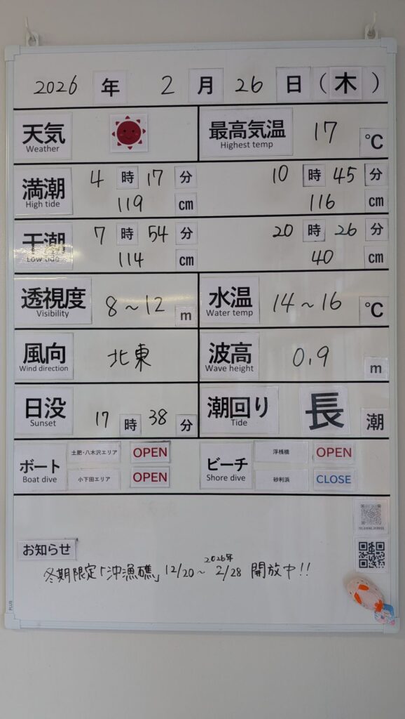 2026年2月26日 / 最終更新日 : 2026年2月26日 toids2021 海況情報 ビーチのみ【OPEN】、ボートは【CLOSE】です。 東風で非常に穏やかな海況です。 しかしながら東風が強すぎるため、ボートは出船困難につきCLOSE。 ビーチは快適コンディションです! FacebookXCopy