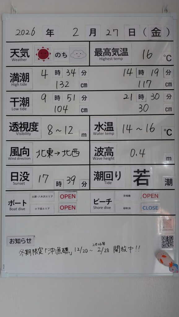 2026年2月27日 / 最終更新日 : 2026年2月27日 toids2021 海況情報 ビーチ&ボートともに【OPEN】です。 終日風もなく非常に穏やかな海況です。 ボートも快適に出船可能です。 FacebookXCopy