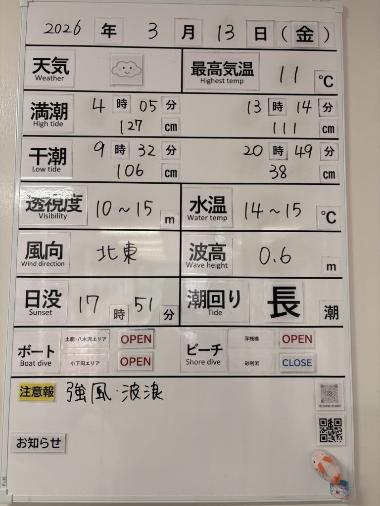 2026年3月13日 / 最終更新日 : 2026年3月13日 toids2021 海況情報 ビーチ&ボートともに【OPEN】です。 穏やかな海況です。 ボートは小下田エリアまで出船可能です。 冷え込みますので寒さ対策をしっかりと! FacebookXCopy