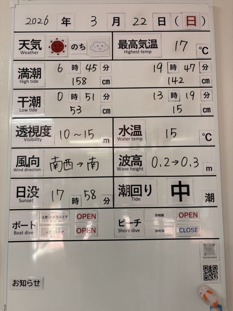 2026年3月22日 / 最終更新日 : 2026年3月22日 toids2021 海況情報 ビーチ&ボートともに【OPEN】です。 ほぼ無風で穏やかな海況です。 ボートは小下田エリアまで出船可能です。 FacebookXCopy