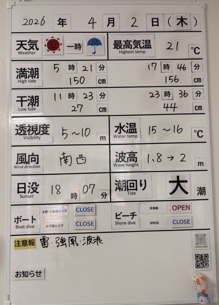 2026年4月2日 / 最終更新日 : 2026年4月2日 toids2021 海況情報 ビーチのみ【OPEN】、ボートは【CLOSE】です。 強い南西の風の影響でボートはオールCLOSEです。 鉄壁の通り崎ビーチは問題なく潜れます。 FacebookXCopy