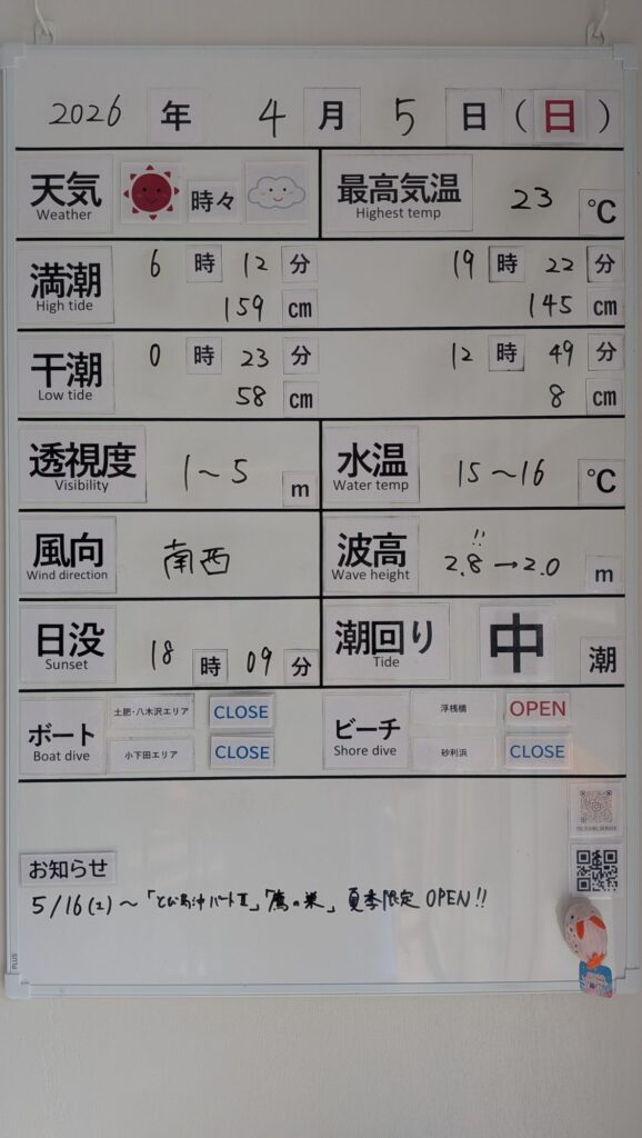 2026年4月5日 / 最終更新日 : 2026年4月5日 toids2021 海況情報 ビーチのみ【OPEN】、ボートは【CLOSE】です。 うねりが大きいため、ボートはオールCLOSEといたします。 鉄壁の通り崎ビーチは潜れますが、若干の揺れと、ひどい濁りがありますのでご注意ください。 FacebookXCopy
