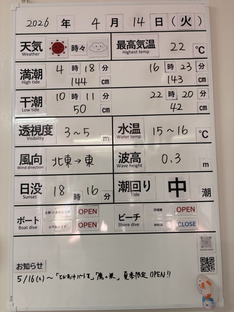 2026年4月14日 / 最終更新日 : 2026年4月14日 toids2021 海況情報 ビーチ&ボートともに【OPEN】です。 ベタ凪で快適にOPEN! ボートは小下田エリアまで問題なく出船できます。 FacebookXCopy
