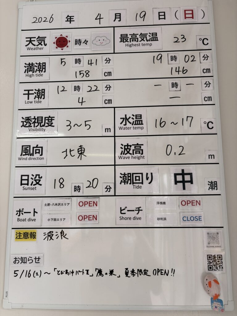 2026年4月19日 / 最終更新日 : 2026年4月19日 toids2021 海況情報 ビーチ&ボートともに【OPEN】です。 非常に穏やかな海況です! ボートは小下田エリアまで問題なく出船可能です。 FacebookXCopy