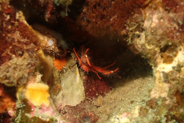 岩の穴の中からホムラチュウコシオリエビが顔を出していました。