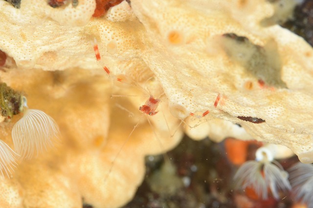 大きな岩の足元で2cmくらいのオトヒメエビを発見。