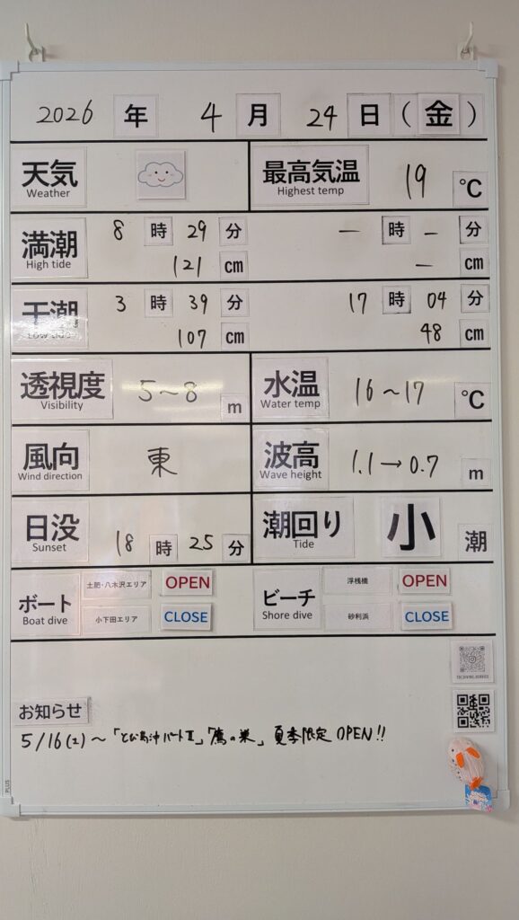 2026年4月24日 / 最終更新日 : 2026年4月24日 toids2021 海況情報 ビーチ&ボートともに【OPEN】です。 東風で穏やかな海況です。 昨晩の爆風の影響で小下田エリアにはうねりが残るため、ボートは八木沢エリアのみのOPENといたします。 FacebookXCopy