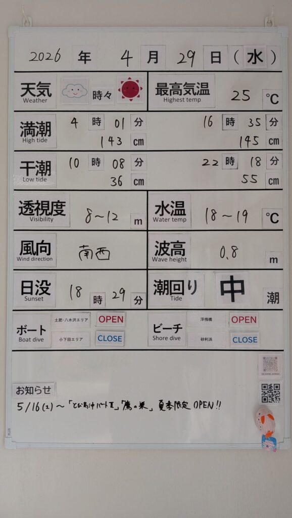 2026年4月29日 / 最終更新日 : 2026年4月29日 toids2021 海況情報 ビーチ&ボートともに【OPEN】です。 ビーチはベタ凪で非常に穏やか! 南西風の影響で小下田エリアはうねりが大きいため、ボートは八木沢エリアのみのOPENといたします。 FacebookXCopy